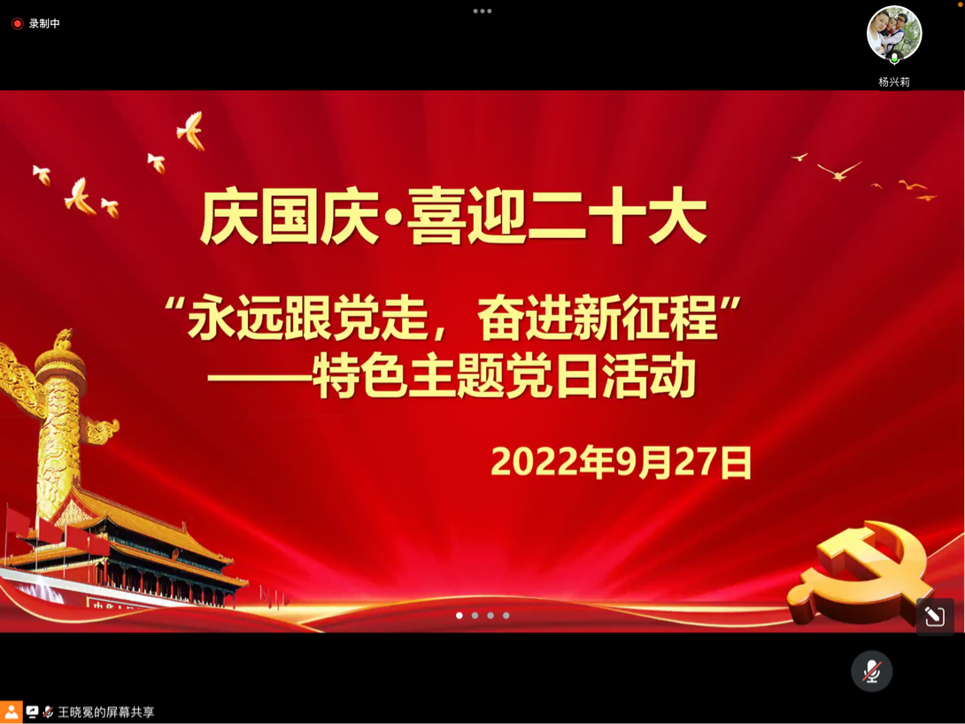 2022年9月27日下午2:30,时博在线(中国)唯一官方网站研究生第一党支部全体党员于腾讯会议线上参会,开展“庆国庆•喜迎二十大—永远跟党走,奋进新征程”主题党日活动。