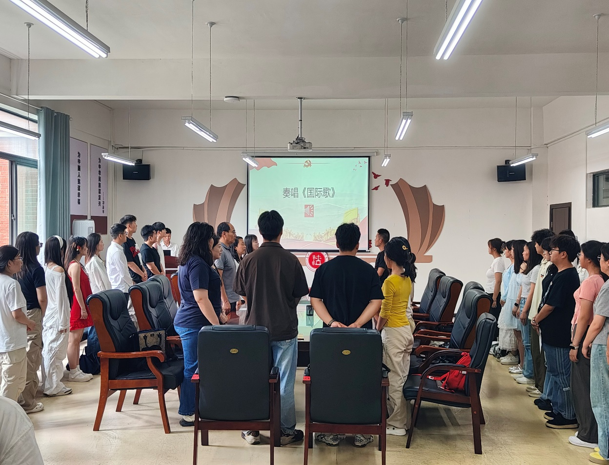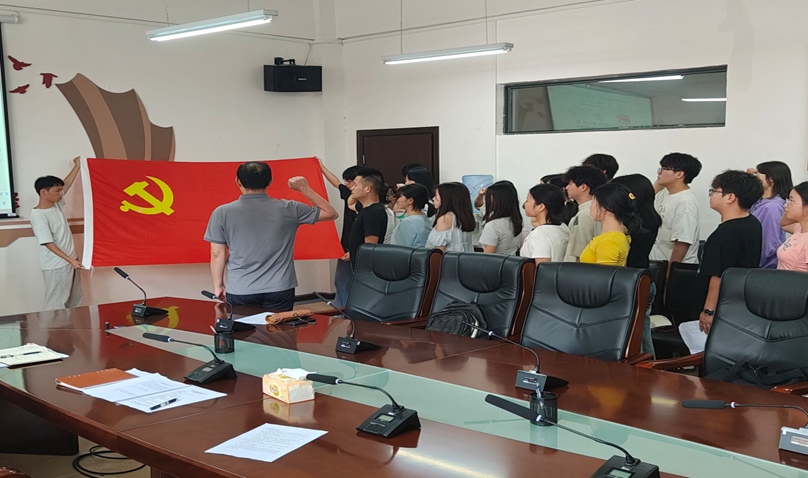 全体奏唱《国际歌》后,邵新顺带领新发展党员面向党旗、高举右拳、庄严宣誓。随后,研究生第一党支部闫康豪、研究生第二党支部吴伟杰、本科生第一党支部李敏、本科生第二党支部饶子豪分别代表新发展党员发言。