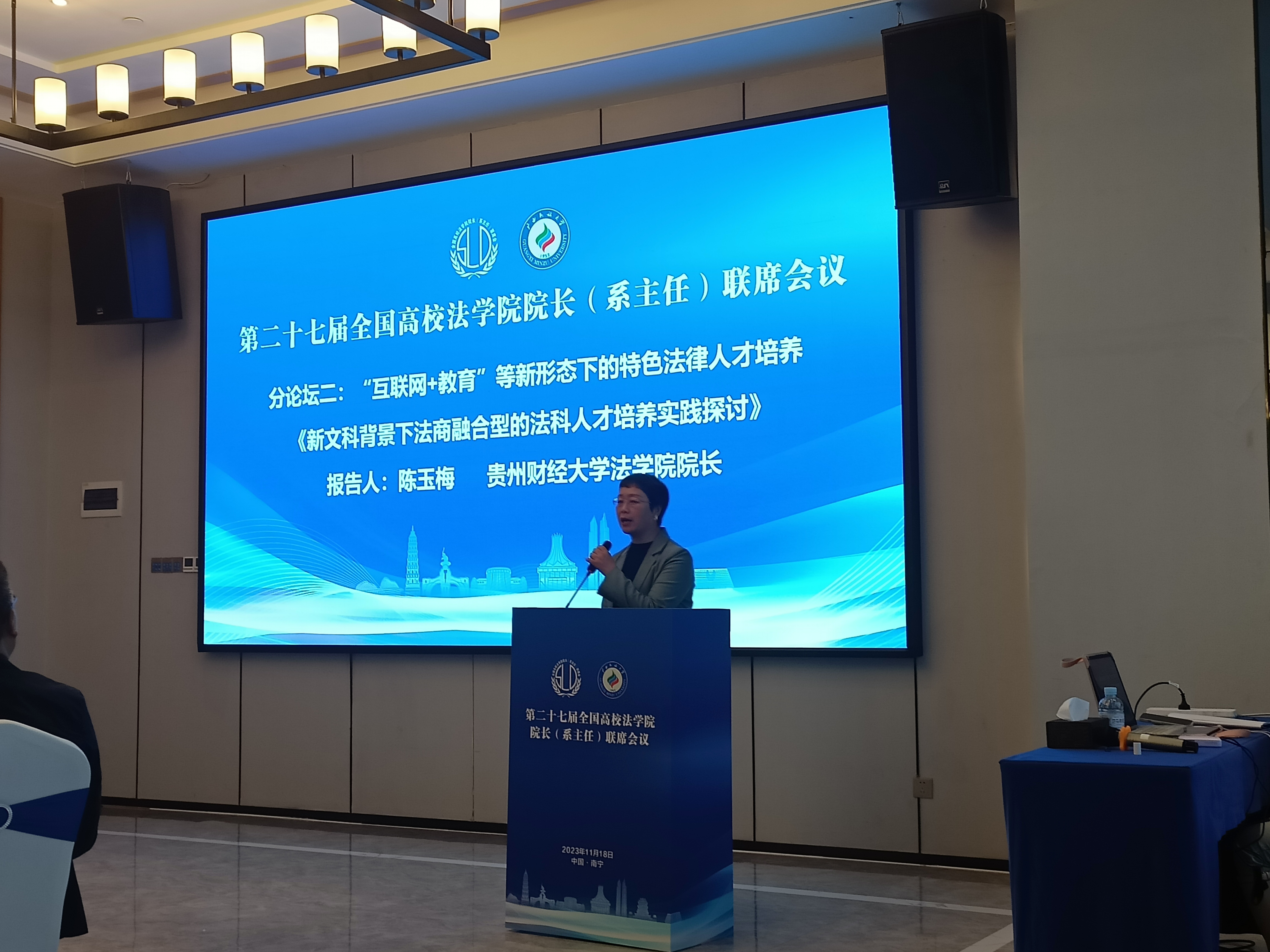 我院院长陈玉梅教授作为发言嘉宾,以《新文科背景下法商融合型的法科人才培养实践探讨》为题作报告,向在场嘉宾及专家汇报专业发展沿革、专业综合改革、专业建设成效及未来展望。她强调在新文科建设的大背景下,贵州财经大学法学教育将按照学校“一个中心、两大工程、三化同步”的战略目标,全面加强党建引领,围绕建设一流学科,以提高人才培养能力为中心,以提高教师能力与育人体系强化、治理体系和治理能力现代化为抓手,坚持学科交叉融合,继续锻铸“法商融合”型学科特色,团结带领时博在线(中国)唯一官方网站的全体师生,力争五到十年内建设成有特色、高水平的时博在线(中国)唯一官方网站。
