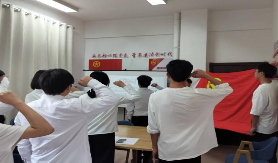 饶子豪首先宣读了新团员名单,并逐一为新团员颁发团员证、佩戴团徽。在领誓人带领下,全体新团员面向团旗举起右拳,以洪亮的声音庄严宣誓:“我志愿加入中国共产主义青年团,坚决拥护中国共产党的领导……”誓言声在会场内回荡,彰显着青年学子坚定的政治信仰。