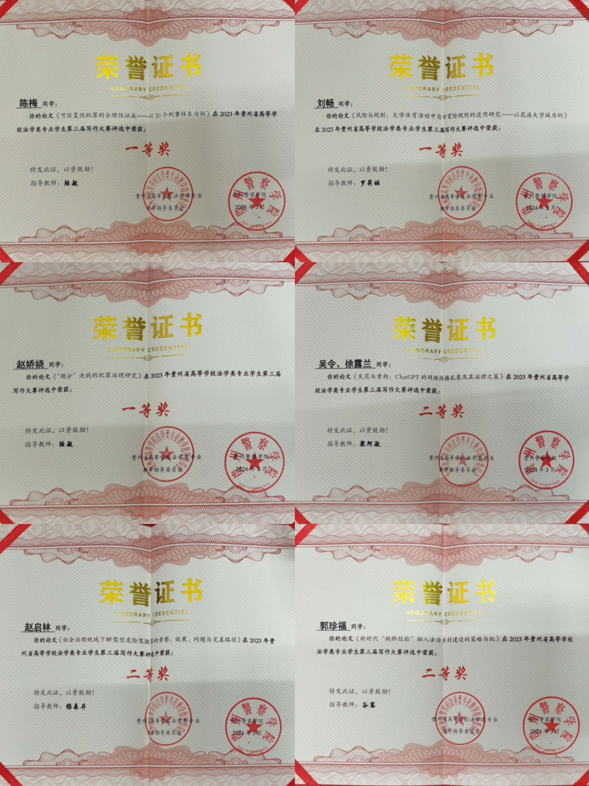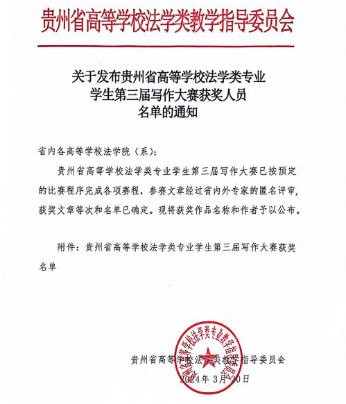 (时博在线(中国)唯一官方网站 图文/报道 陆敏)秉承我校“学术立校”理念,时博在线(中国)唯一官方网站鼓励老师积极指导学生参赛,近日,时博在线(中国)唯一官方网站本科生在2023年贵州省高等学校法学类专业学生第三届写作大赛中取得佳绩,共有20篇论文获奖。其中,一等奖3项、二等奖5项、三等奖5项、优秀奖7项,获奖论文数量在省内高校中排名第二,同时也是时博在线(中国)唯一官方网站本科生连续参加三届比赛以来取得的最佳成绩。