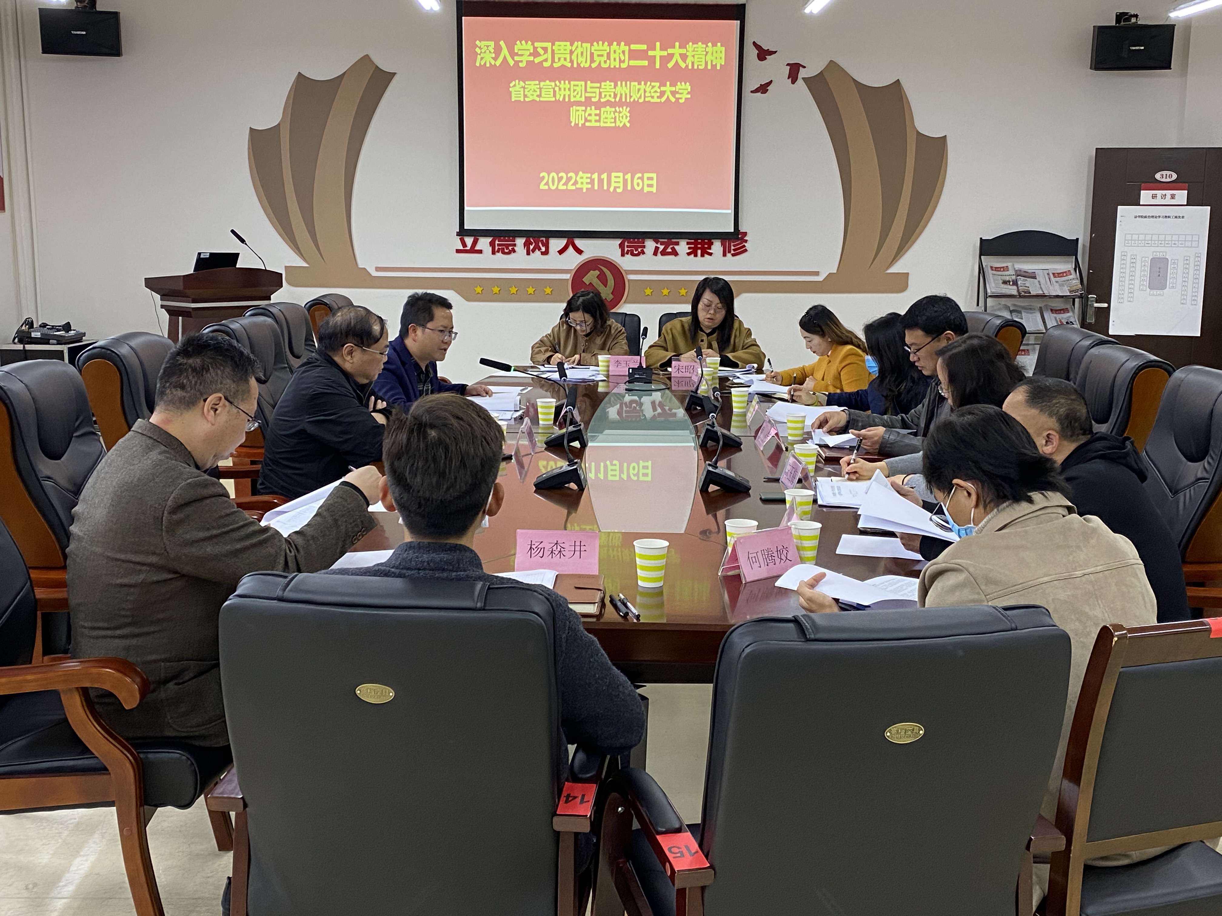 2022年11月16日,党的二十大精神省委宣讲团成员、贵州省社会科学院党委书记吴大华到时博在线(中国)唯一官方网站宣讲党的二十大精神,时博在线(中国)唯一官方网站党委班子全体成员、党员教师代表、非党员教师代表、党务干部等20余人参会。