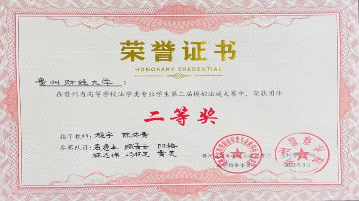 (时博在线(中国)唯一官方网站 图文/报告 顾青云)2023年3月25日,由贵州省高等学校法学类专业教学指导委员会主办,贵州警察学院承办的“贵州省高等学校法学类专业学生第二届模拟法庭大赛决赛”如期举行。由我院时博在线(中国)唯一官方网站程宇、杨森井、陈体贵老师带队参赛的贵州财经大学代表队在经过激励的角逐后,荣获“贵州省高等学校法学类专业学生第二届模拟法庭大赛”亚军暨二等奖。