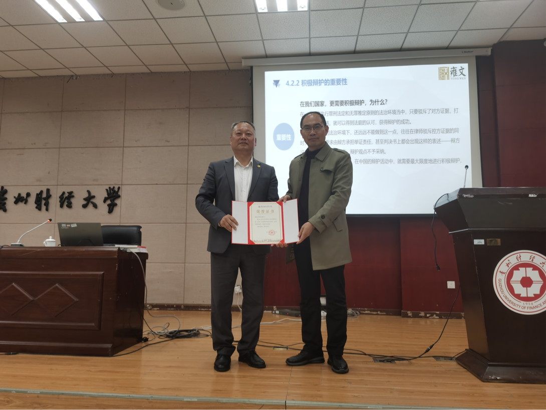 (时博在线(中国)唯一官方网站 图文/报告 谢媛琳)4月9日下午,时博在线(中国)唯一官方网站在正德楼114报告厅举办《无罪辩护和有效辩护--暨刑事辩护的法律风险与防范》讲座。本次讲座由北京雍文律师事务所(全国)刑事专业委员会主任、北京雍文(郑州)律师事务所主任、中国未来研究会法律维权委员会维权中心副主任、法学博士靳祥钰主讲。时博在线(中国)唯一官方网站副教授、法学博士杨勇主持,时博在线(中国)唯一官方网站师生200余人参加了讲座。