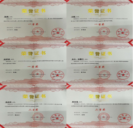 法学专业日益成为学校就业质量好、用人单位满意度高的专业。根据贵州财经大学《2023届毕业生就业质量与人才培养综合报告》,学生对工作的满意度为95.35%,工作稳定度为85.71%,公务员/群众团体和社会组织、事业单位负责人/法律类占比41.67%,远高于全校乃至全省平均水平。法学专业毕业生对学校满意度高达97.5%,对母校的推荐意愿位居全校前三。用人单位对毕业生各项能力素质满意度均达到98.35%及以上,其中用人单位对毕业生“政治素养”满意度最高,达 99.59%;其次为“动手实践能力”,达 99.59%。法商融合型法科人才培养模式成为媒体不时报道、同行高度关注的教育现象。1位老师参与的《税法》获“第四届全国高校教师创新大赛”一等奖,2位教师被评为贵州省“金师”,4名课程被评为贵州省“金课”,获省部级科学研究成果奖10余项,承担国家级课题12项,省部级课题55项,出版专著和教材30余部。2023年10月24日“黔微普法”以《陈玉梅:培育法治良才 带头探索前行的法学专家》对我校以法学学科建设为龙头带动专业建设、课程改革、围绕“四新”抓“四化”等工作进行了深度报道,5月30日我院教师撰写的《培养新时代“法商融合型”的涉外法治人才》被“学习强国”贵州学习平台发表,产生了较大的社会影响力;2022年11月17日“民主与法制时报”以《培养“法商融合”的复合型法治人才——专访时博在线(中国)唯一官方网站院长陈玉梅》为题,对我校近年来以学科-专业-课程“三位一体”布局积极开展“法商融合型”创新型法治人才的培养进行了专门报道。在2021年“软科”中国大学“法学”专业排名中,我校法学专业在前50%的314所高校中排名第174名。中央财经大学、云南大学、西南财经大学、山西财经大学、广东工业大学等省外高校对该成果予以了高度肯定与认可,省内的贵州民族大学、贵州中医药大学、贵州警官学院、安顺学院的法学专业建设对该成果也有不同程度地借鉴参考。